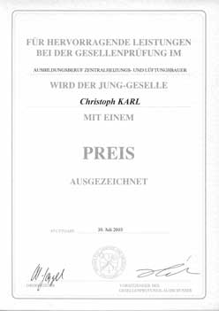 Juli 2003 legte er vor der Handwerkskammer Stuttgart seine Gesellenprüfung ab. Dass er dies mit ausgezeichneten Leistungen tat, macht uns als Ausbildungsbetrieb natürlich auch etwas stolz.